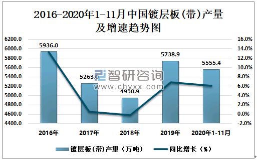 根据国家统计局数据显示:2020年11月中国镀层板(带)产量为576.1万吨,同比增长9.3%;2020年1-11月中国镀层板(带)产量为5555.4万吨,同比增长6.1%。