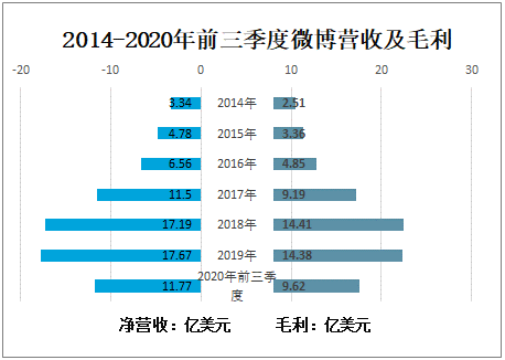 2020年微博前三季度总净营收累计11.77亿美元,毛利累计9.62亿美元。
