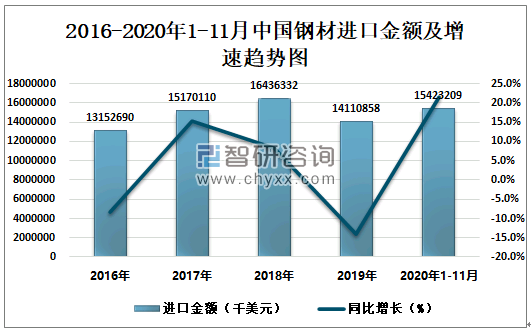 2016-2020年1-11月中国钢材进口金额及增速趋势图