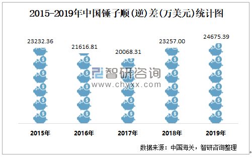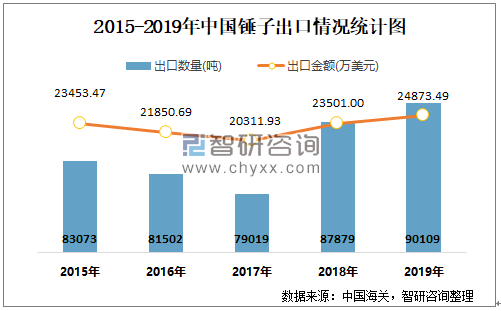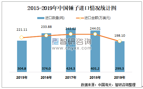 根据中国海关数据显示:2019年1-12月中国锤子进口数量为299.34吨,进口金额为198.1万美元;2019年1-12月锤子出口数量为90109.28吨,出口金额为24873.49万美元。