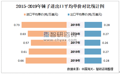 根据中国海关数据统计可知:2015-2019年中国锤子出口金额大于进口金额,进出口顺差规模较大;2015-2019年中国锤子出口平均单价相对平稳,涨跌幅度较小,进口平均单价均高于出口平均单价。
