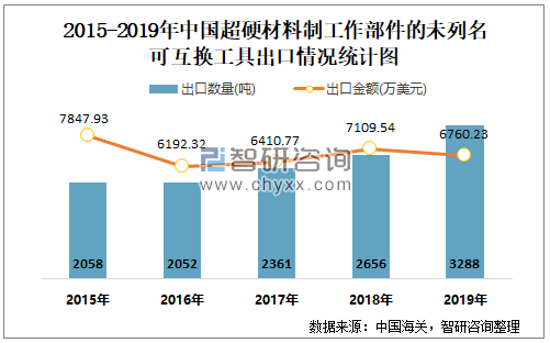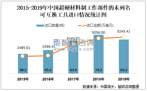 根据中国海关数据显示:2019年1-12月中国超硬材料制工作部件的未列名可互换工具进口数量为65.15吨,进口金额为5243.41万美元;2019年1-12月超硬材料制工作部件的未列名可互换工具出口数量为3288.23吨,出口金额为6760.23万美元。
