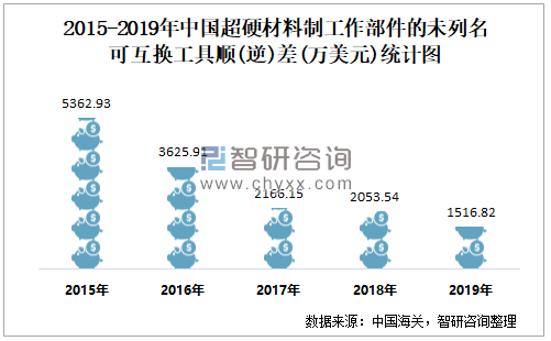 2015-2019年中国超硬材料制工作部件的未列名可互换工具顺(逆)差统计图