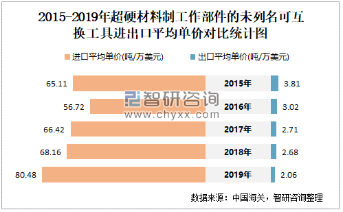 2015-2019年中国超硬材料制工作部件的未列名可互换工具进出口平均单价对比统计图