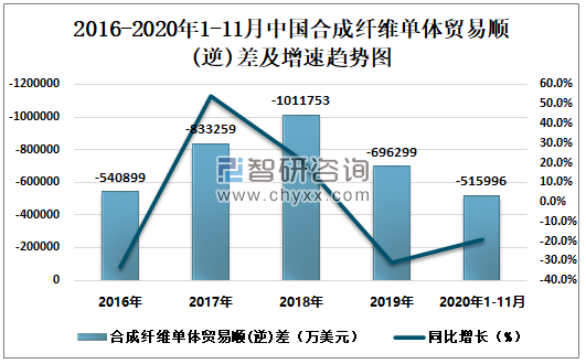 2016-2020年1-11月中国合成纤维单体贸易顺(逆)差及增速趋势图