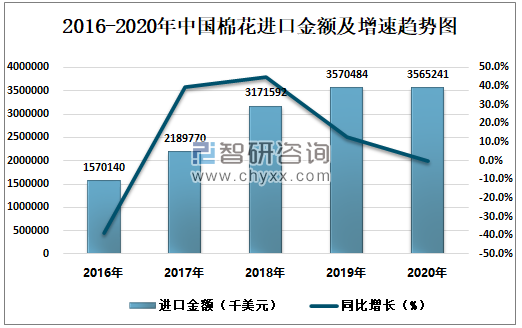 2016-2020年中国棉花进口金额及增速趋势图