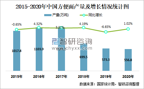 根据国家统计局数据显示:2020年12月中国方便面产量为57.3万吨,同比下降5.04%;2020年1-12月中国方便面累计产量为556.8万吨,同比增长1.02%;2015-2020年中国方便面产量2016年达到最高,此后逐年递减。