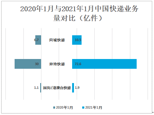 2021年1月份,中国快递服务企业业务量完成84.9亿件,同比增长124.7%;业务收入完成867.6亿元,同比增长73.3%。其中,同城业务量完成10.5亿件,较2020年同期增加了3.8亿件;异地业务量完成72.6亿件,较2020年同期增加了42.6亿件;国际/港澳台业务量完成1.9亿件,较2020年同期增加了0.8亿件。