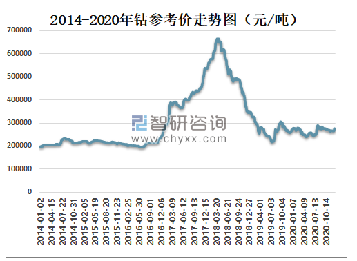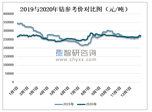 从2019与2020年钴参考价对比数据来看,2020年1-5月钴参考价低于2019年同期,6月后开始增长,且高于2019年同期,8月后钴参考价开始趋于平稳,9月、10月均低于2019年同期,11月、12月略高于2019年同期。2020年12月31日钴参考价为272666.66元/吨,较2019年同期增加了6166.66元/吨。
