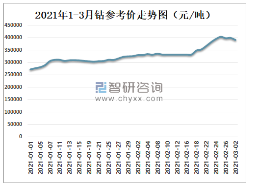 自2021年年初开始钴参考价稳步上升,2021年3月2日钴参考价为390333.34元/吨,较2021年1月1日增加了117666.68元/吨。原料端紧张持续驱动钴涨价行情,市场看涨情绪高涨。供给端受南非物流运力影响国内钴原料紧缺仍无缓解迹象,钴中间品继续看涨,节后下游需求回暖,后市钴需求端有望边际改善,钴价仍有上行空间。