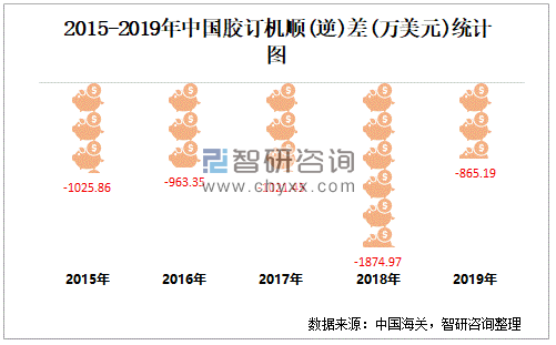 根据中国海关数据统计可知:2015-2019年中国胶订机出口金额小于进口金额,进出口逆差规模2018年扩大至最大值;2015-2019年中国胶订机进口平均单价近3年逐年上涨,出口平均单价均小于进口平均单价。