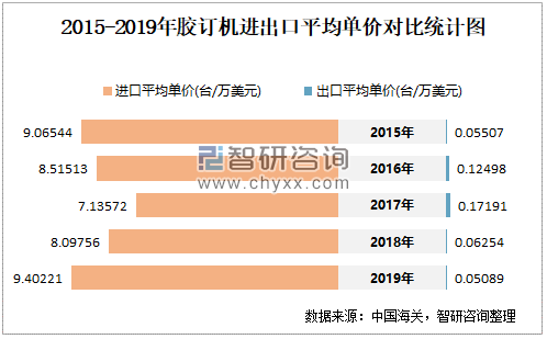 2015-2019年中国胶订机进出口平均单价对比统计图