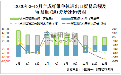 2020年3-12月合成纤维单体进出口贸易总额及贸易顺(逆)差增速统计图