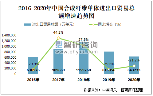 2016-2020年中国合成纤维单体进出口贸易总额及增速趋势图