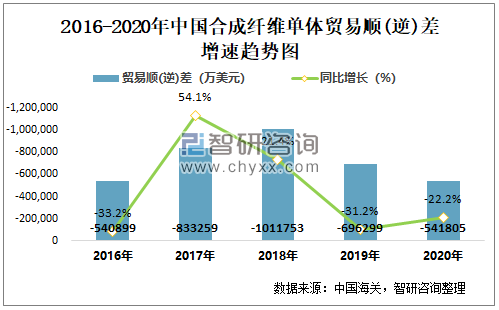 2016-2020中国合成纤维单体贸易顺(逆)差及增速趋势图