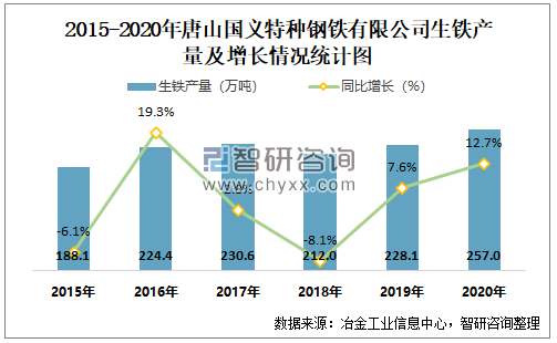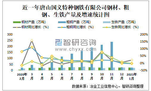 根据冶金工业信息中心数据显示:2020年1-12月唐山国义特种钢铁有限公司钢材产量为263.4万吨,同比增长20.1%,粗钢产量为271.8万吨,同比增长13.4%,生铁产量为257万吨,同比增长12.7%;2021年1月唐山国义特种钢铁有限公司钢材产量为24.4万吨,同比增长23.1%,粗钢产量为22.8万吨,同比下降1.21%,生铁产量为22.4万吨,同比下降0.86%。