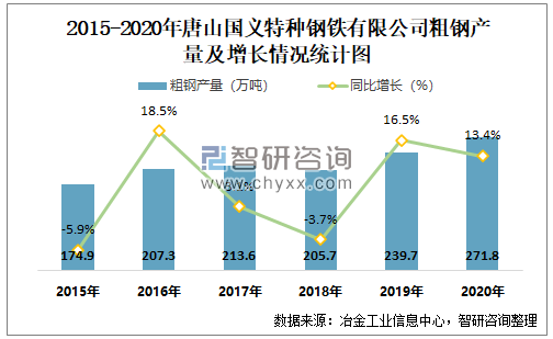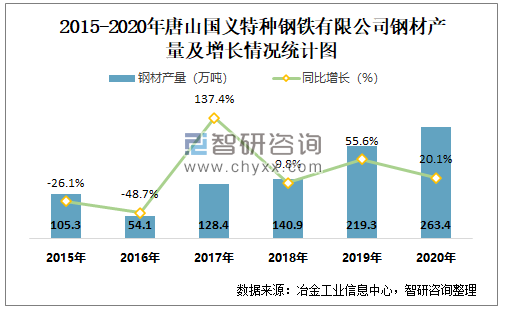 2015-2020年唐山国义特种钢铁有限公司钢材产量及增长情况统计图