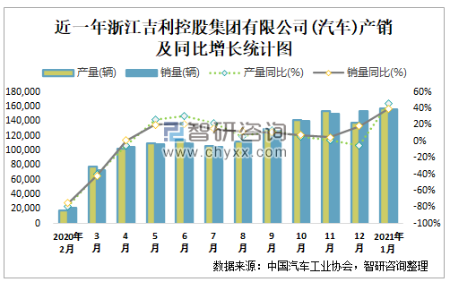 近一年浙江吉利控股集团有限公司(汽车)产销及同比增长统计图