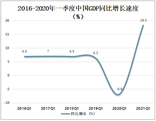 从2016-2020年一季度中国GDP同比增长速度图可以看出,2016-2019年一季度中国GDP同比增长速度相对较为平稳,受新冠肺炎疫情影响,2020年一季度中国GDP同比增长速度大幅下滑,2021年增长明显,2021年一季度中国国内生产总值(GDP)实现了18.3%的高速增长。