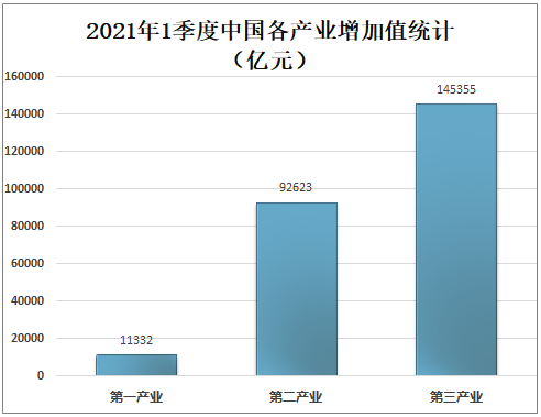 2021年1季度中国第一产业增加值为11332亿元,占中国国内生产总值的4.55%;第二产业增加值为92623亿元,占中国国内生产总值的37.15%;第三产业增加值为145355亿元,占中国国内生产总值的58.30%,占比最大。