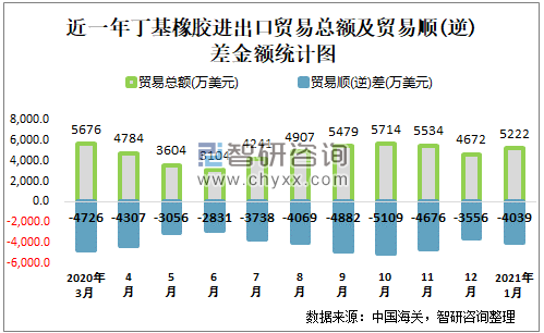 根据中国海关数据显示:2021年1月中国丁基橡胶进出口贸易总额为5222万美元,贸易逆差为4039万美元;2020年12月中国丁基橡胶累计进出口贸易总额为58345万美元,同比下降7.5%,累计贸易逆差为50170万美元,同比下降6.6%。