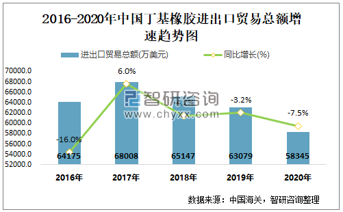 2016-2020年中国丁基橡胶进出口贸易总额及增速趋势图