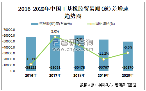 2016-2020中国丁基橡胶贸易顺(逆)差及增速趋势图