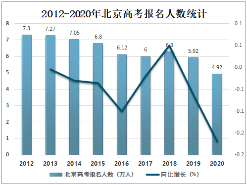 总体来看北京高考报名人数呈下滑趋势,2020年北京高考报名人数为4.92万人,较2019年减少了1万人,同比减少16.86%。