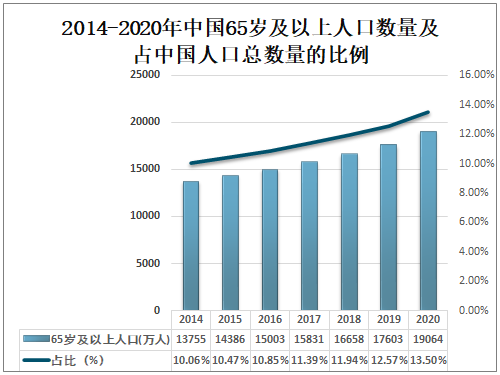 2014-2020年中国65岁及以上人口数量及占中国人口总数量的比例