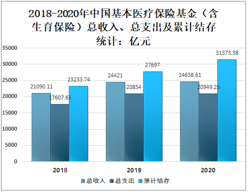 2018-2020年中国基本医疗保险基金(含生育保险)总收入、总支出及累计结存统计:亿元