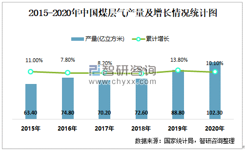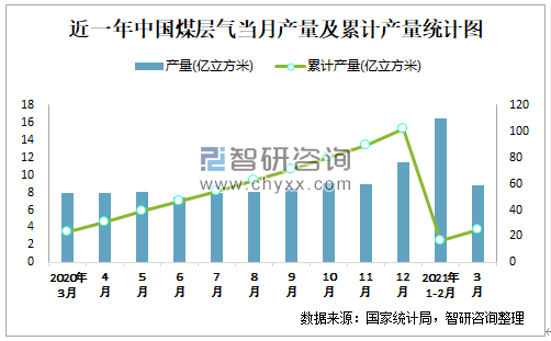 根据国家统计局数据显示:2021年3月中国煤层气产量为8.8亿立方米,同比增长14.6%;2021年1-3月中国煤层气累计产量为25.3亿立方米,累计增长14.3%;2015-2020年中国煤层气产量总体呈上升趋势。