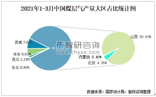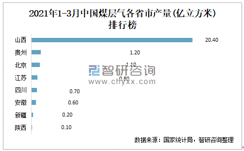 根据国家统计局数据显示:2021年1-3月中国煤层气主要集中在华北、西南、华东地区生产;2021年1-3月中国煤层气产量大区分布不均衡,其中华北地区产量最高,特别是山西省贡献了最多产量;2021年1-3月中国煤层气各省市产量top1遥遥领先于其他前7名,山西、贵州、北京等省市产量较多。
