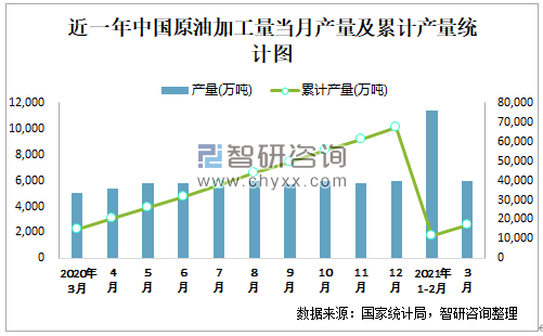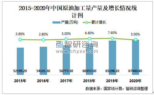 根据国家统计局数据显示:2021年3月中国原油加工量产量为5979万吨,同比增长19.7%;2021年1-3月中国原油加工量累计产量为17403.9万吨,累计增长16.5%;2015-2020年中国原油加工量产量逐年递增。