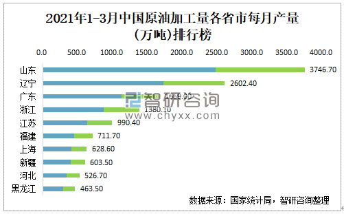 2021年1-3月中国原油加工量各省市每月产量排行榜