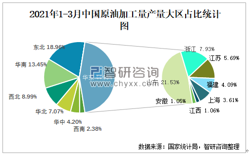 根据国家统计局数据显示:2021年1-3月中国原油加工量主要集中在华东、东北、华南地区生产;2021年1-3月中国原油加工量产量大区分布不均衡,其中华东地区产量最高,特别是山东省贡献了最多产量;2021年1-3月中国原油加工量各省市产量呈现梯队式分布,山东、辽宁、广东等省产量较多。