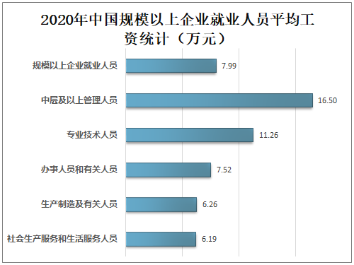 2020年全国规模以上企业就业人员年平均工资为7.99万元,同比增长6.1%。其中,中层及以上管理人员16.5万元,增长5.2%;专业技术人员11.26万元,增长6.4%;办事人员和有关人员7.52万元,增长6.0%;社会生产服务和生活服务人员6.19万元,增长3.2%;生产制造及有关人员6.26万元,增长5.1%。中层及以上管理人员平均工资最高,是全部就业人员平均水平的2.07倍;社会生产服务和生活服务人员平均工资最低,是全部就业人员平均水平的78%。岗位平均工资最高与最低之比为2.66,比上年扩大0.03。