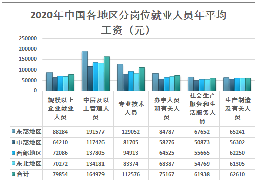 分四大区域看,五类岗位平均工资最高的区域均为东部,平均工资分别为中层及以上管理人员191577元、专业技术人员129052元、办事人员和有关人员84787元、社会生产服务和生活服务人员67652元、生产制造及有关人员65241元。五类岗位平均工资最低的区域均为中部,分别为117426元、81705元、58276元、50873元和56302元。