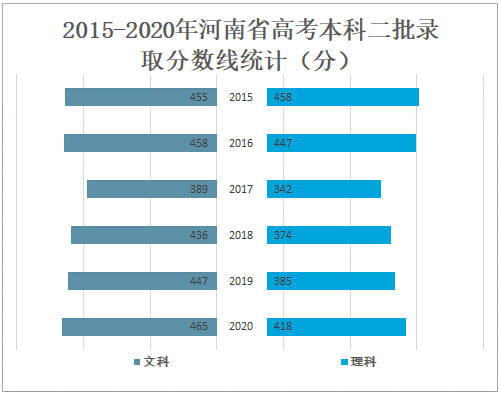 2020年河南省高考本科二批文科录取分数线为465分,较2019年增加了18分;理科录取分数线为418分,较2019年增加了33分。
