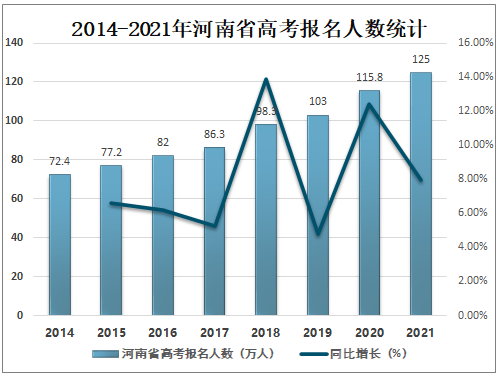 2021年河南省高考报名人数达125万人,较2020年增加了9.2万人,同比增长7.94%,南不愧为号称地狱级高考大省,去年115.8万已经突破新高,今年再创新高。
