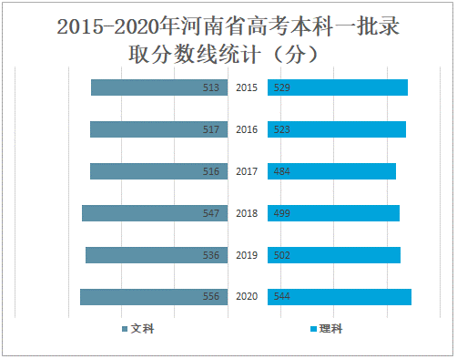 2020年河南省高考本科一批文科录取分数线为556分,较2019年增加了20分;理科录取分数线为544分,较2019年增加了42分。