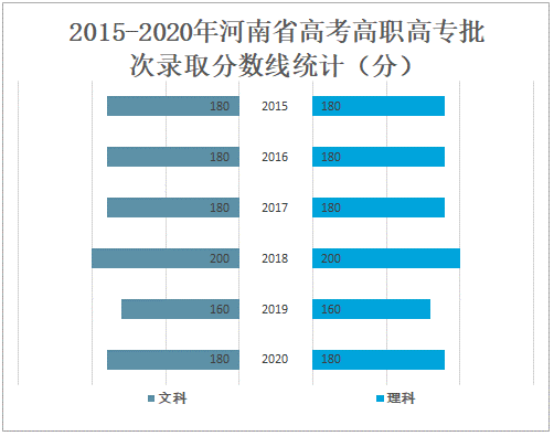 2020年河南省高考高职高专批次文科录取分数线为180分,较2019年增加了20分;理科录取分数线为180分,较2019年增加了20分。