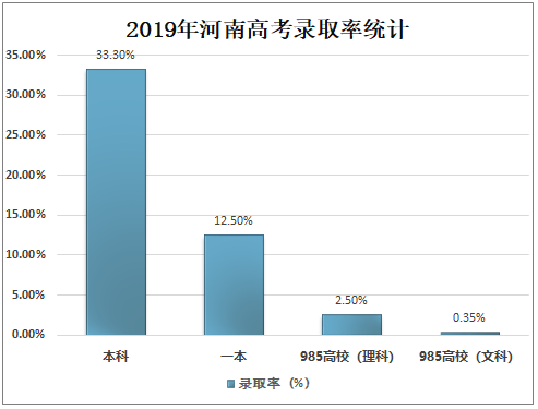 2019年河南高考人数103万,本科录取率只有33.3%(在全国排名比较靠后),录取人数为34万,粗略估算一下,剩余69万人只能上专科或复读或辍学。而河南省一本录取率只有12.5%,在全国是倒数,录取人数只有12.9万人;其中,985高校的录取率就更低了,理科录取率2.5%,文科录取率仅为0.35%。