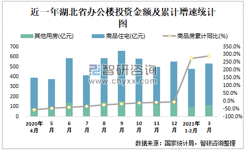 根据国家统计局数据统计可知:2021年3月湖北省房地产开发投资商品房投资金额为529.75亿元,其中包括办公楼、商业营业用房等其他用房114.68亿元(注:办公楼、商业营业用房未分开统计);2021年1-3月湖北省房地产开发投资包括办公楼在内的其他用房累计金额为212.74亿元。