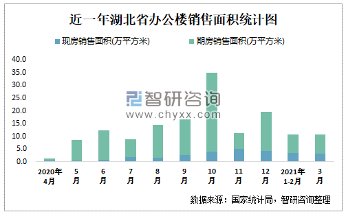 根据国家统计局数据可知:2021年3月湖北省办公楼销售面积为10.63万平方米(其中销售现房3.26万平方米,期房7.37万平方米);2021年1-3月湖北省办公楼累计销售面积为21.34万平方米;近一年湖北省办公楼期房销售面积远高于现房销售面积;2021年3月江苏、四川、广东的办公楼销售面积最多,特别是江苏现房销售面积最多,湖北省办公楼销售面积与其他省市相比,处于中等水平。