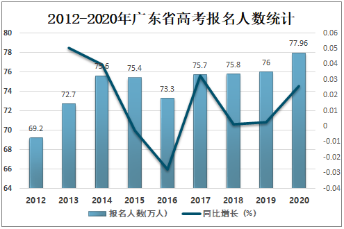 自2017年起广东省高考报名人数逐年增加,2020年广东省高考报名人数达77.96万人,较2019年增加了1.96万人,同比增长2.58%。