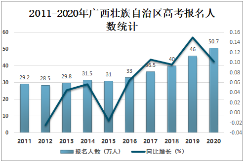 自2012年起广西壮族自治区高考报名人数逐年增加,2020年广西壮族自治区高考报名人数达50.7万人,较2019年增加了4.7万人,同比增长10.22%。