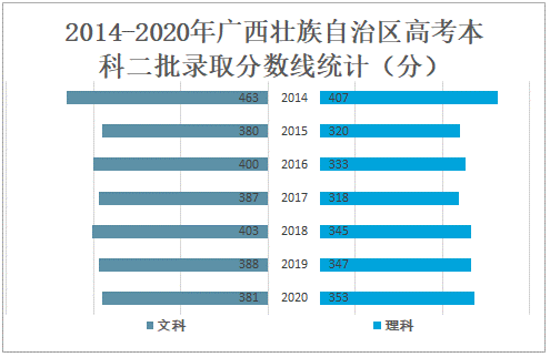 2020年广西壮族自治区高考本科二批文科录取分数线为381分,较2019年减少了7分;理科录取分数线为353分,较2019年增加了6分。