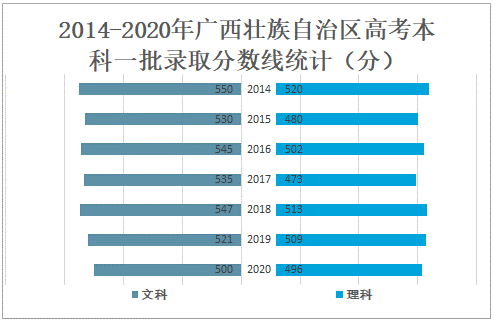 2020年广西壮族自治区高考本科一批文科录取分数线为500分,较2019年减少了21分;理科录取分数线为496分,较2019年减少了13分。