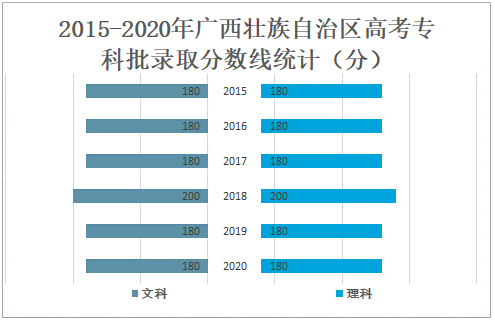 2020年广西壮族自治区高考专科文科录取分数线为180分,与2019年持平;理科录取分数线为180分,与2019年持平。