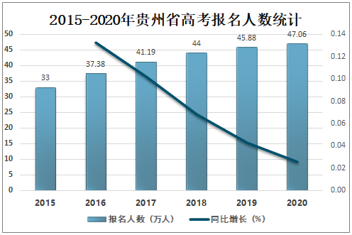 近年来贵州省高考报名人数逐年增加,2020年贵州省高考报名人数达47.06万人,较2019年增加了1.18万人,同比增长2.57%。